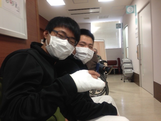 試合で怪我したふたり、インフルエンザ予防のマスクをして・・・